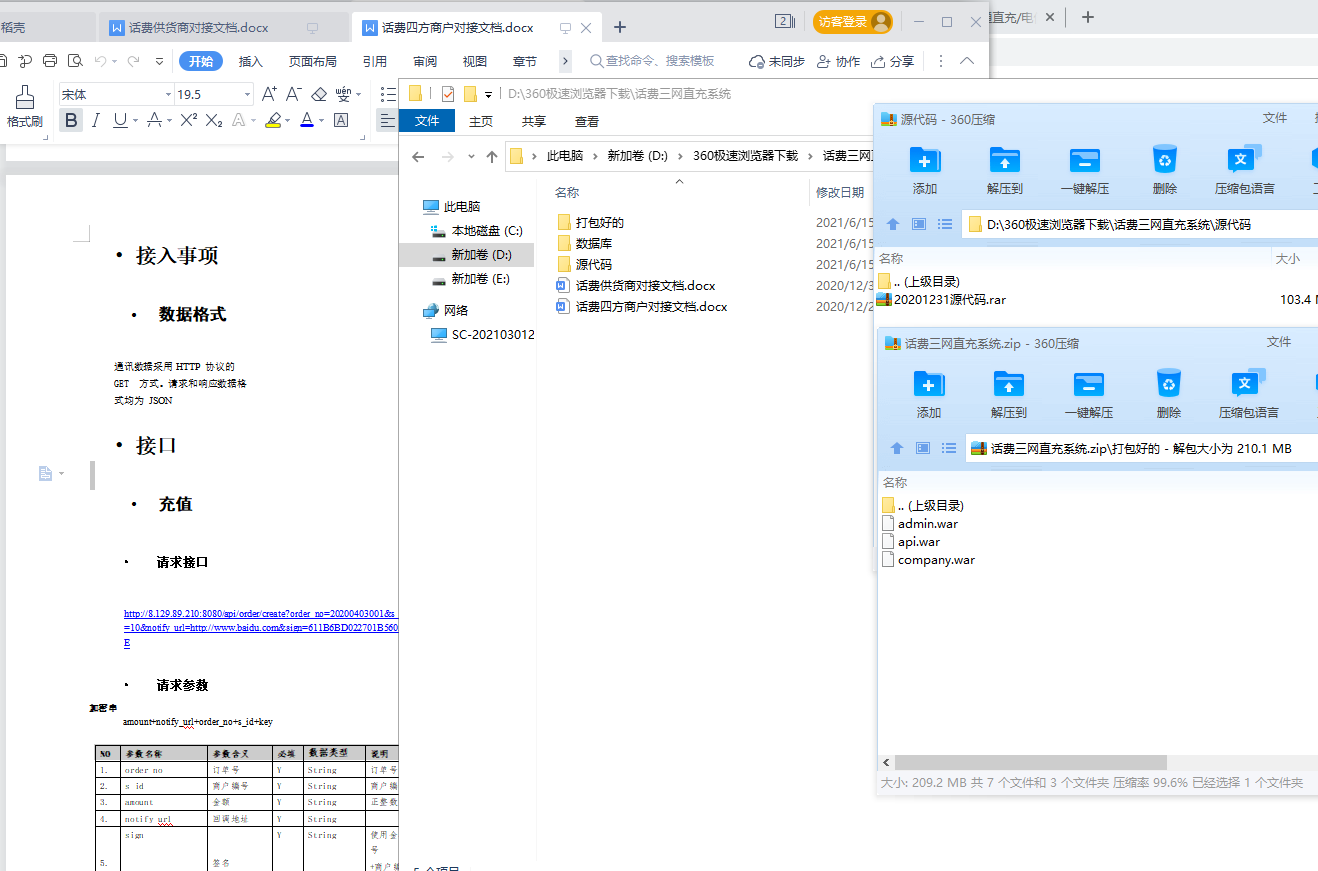 文档有:话费供货商对接文档、话费四方商户对接文档